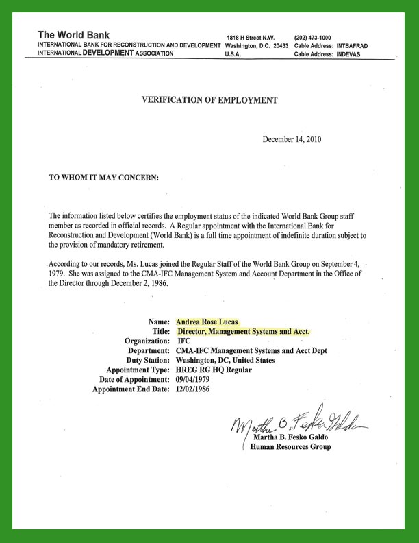 এন্ড্রিয়া লুকাসকে যে ডিপার্টমেন্ট এ চাকুরী দেখানো হেয়ছে ঐনামে তাদের কোন ডিপার্টমেন্ট নাই। চাকুরী যেহেতু ১৯৮৬ সালে শেষ হয়েছে সেহেতু সার্টিফিকেটটাও ঐ সময়ের হওয়ার কথা অথচ ইস্যু ডেট ডিসেম্বর ১৪, ২০১০। যা একেবারেই অযৌক্তিক মনে হয়েছে।