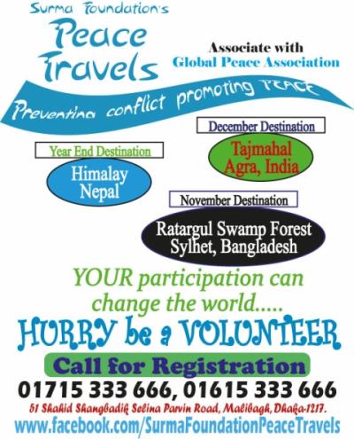 সুরমা ফাউেন্ডশন এর "পিস ট্রাভেলস প্রোগ্রাম" এ যোগ দিন। নিজেকে একজন "পিস ভলান্টিয়ার" হিসাবে শান্তি প্রতিষ্ঠায় এগিয়ে আসুন। রেজিষ্ট্রেশনের ও বিস্তারিত তথ্যের জন্য আজই যোগাযোগ করুন...........