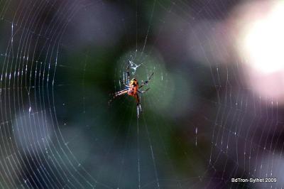 বুনো মাকড়শা, এগুলা অনেক বড় বড় জাল বানায়। আমি ২/৩ ফুট জাল ও দেখেছি। ছবিতে অবশ্য বোঝা যাচ্ছে না।