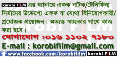 korobi FiLM এর ব্যানারে নাটক, ডকুমেন্টারি নির্মানে আগ্রহী। একক বা যৌথ ভাবে বিনিয়োগে আগ্রহীদের আমাদের সাথে যোগাযোগ করতে অনুরোধ করা হলো।