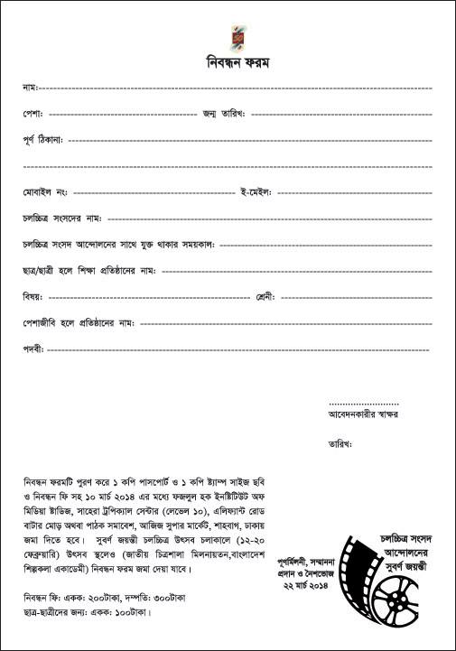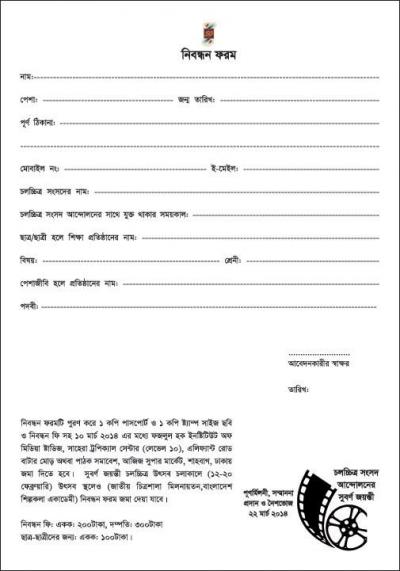 বাংলাদেশের চলচ্চিত্র সংসদ আন্দোলনের সাথে যুক্ত সকল কর্মীদের নিম্নোক্ত ফরম টি পূরণ করে ফরমে উল্লেখিত স্থানে জমা দেয়ার জন্য অনুরোধ জানাচ্ছি।