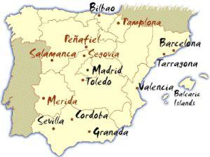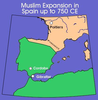 আইবেরিয় উপদ্বীপের মানচিত্র। আইবেরিয়া নামটি দিয়েছিল গ্রিকরা। এই আইবেরিয় উপদ্বীপের দক্ষিণ অংশকেই আরবরা বলত: আল আন্দালুস। পূর্বে এখানে ভ্যান্ডাল-শাসন ছিল। সম্ভবত ভ্যান্ডালুসিয়া থেকেই আল আন্দালুসিয়ার উদ্ভব ঘটেছে। আরব শাসনের কারণে উপদ্বীপটি মুরিশ আইবেরিয়া নামেও পরিচিত।