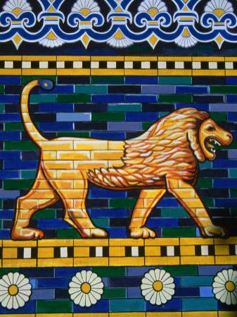 যুদ্ধের দেবী ইশতার-এর বাহন সিংহ। দেবী সিংহের পিঠে চড়ে যুদ্ধ করতেন, হাতে থাকে ধনুক ও তূণ ভর্তি তীর। ব্যাবিলনিয় শিল্পী সে কথা মনে করিয়ে দিতেই যেন ব্যাবিলনের এক দেওয়ালের গায়ে উজ্জ্বল ইঁটের টাইলস-এ এঁকেছেন সিংহ।