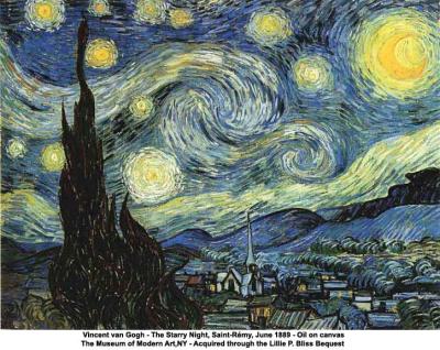 নক্ষত্রময় রাত্রি। ফ্রান্সে থাকাকালীন বিখ্যাত ‘স্টারি নাইট’ আঁকেন। দিনের চেয়ে ভালোবাসতেন রাত। বলেছিলেন-I often think that the night is more alive and more richly colored than the day.