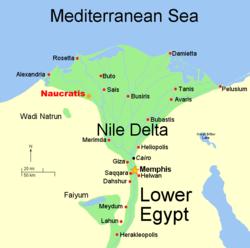 প্রাচীন মিশরের মানচিত্রে মেমফিস-এর অবস্থান। নাওক্রাটিস নগরের এর দক্ষিণে। তখনকার দিনে জলপথেই যাতায়াত সহজ ছিল।