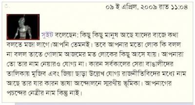 সুইট বলেছেন: কিছু কিছু মানুষ আছে যাদের বাজে কথা বলতে মজা লাগে।আপনি তেমনই। তবে আপনার মতো লোক কি বলল না বলল তাতে গোলাম আজমের মত লোকের কিছু আসে যায়। আপনারা তো তার নাম নেয়ারও যোগ্য না। কারন সর্বকালের সেরা বাঙালীদের তালিকায় মুজিব এবং জিয়া ছাড়া উল্লেখ যোগ্য রাজনীতিবিদের মধ্যে নাম আছে তার যার কারন ভাষা আন্দোলনে স্মরণীয় ভূমিকা। আপনাগের পচন্দের নেত্রীর নাম কিন্তু নাই।