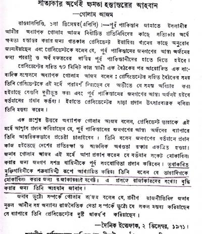 *১৬ অক্টোবর ১৯৭১, বায়তুল মোকারমে তৌহিদী জনতার এক সভায় গোলাম আযম বলেন, তথাকথিত বাংলাদেশের আন্দোলনের ভূয়া শ্লোগানে কান না দিয়ে পাকিস্তানকে নতুনভাবে গড়ে তোলার আহ্বান জানাচ্ছি।
