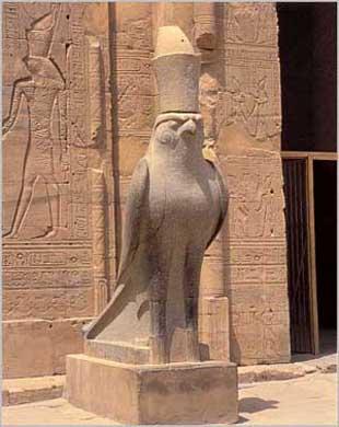 এডফু শহরে সব চাইতে বেশী সুরক্ষিত মন্দির দেবতা হোরাসের নামে রয়েছে । নিচে ঐ মন্দিরের সামনের হোরাস মূর্তি দেখা যাচ্ছে ।