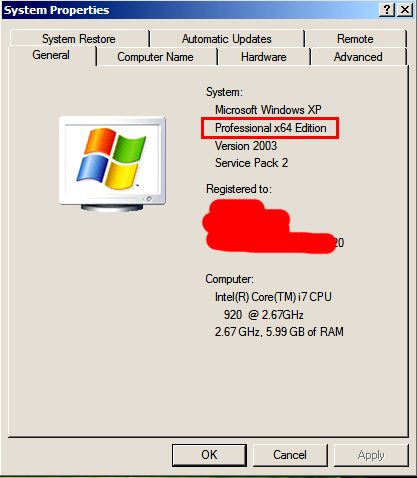 যারা এখনো জানেন না যে তাদের উইন্ডোজ কত বিট এর? অর্থ্যাৎ ৩২ নাকি ৬৪ বিট এর!! তারা My Computer এর রাইট ক্লিক করে Properties এর বক্স এ দেখুন। তথ্যটা পেয়ে যাবেন। আমার উইন্ডোজটা ৬৪ বিট এর তাই আমি নীচের মত এরকম তথ্য পেয়েছি!!