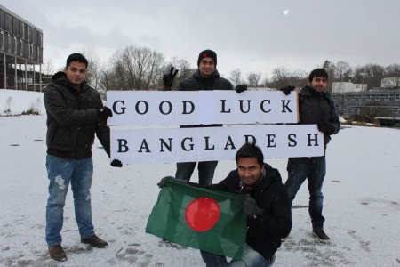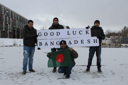 একই ভাবে প্রচন্ড তুষার পাত উপেক্ষা করে Universität, Campus Vaihingen, Stuttgart এর স্টুডেন্টরা বাংলাদেশ দলকে শুভ কামনা জানিয়েছেন । গায়ে বাংলাদেশ দলের জার্সি আর হাতে লাল সবুজ পতাকা হাতে প্রিয় দলের জন্য শুভ কামনা জানানোর কাছে হিমাঙ্কের নিচের তাপমাত্রা যেন কিছুই নয়।