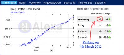 এবার আসি এই পোস্টের টাইটেলের আলোচনায়। Google, Facebook, Youtube... এরপর? হয়ত ভাবছেন আবোল-তাবোল বকছি। আসলে আমি নিজেও প্রথমে তাই ভেবেছিলাম, কিন্তু পরে ব্যাপারটা একটু ঘেটে দেখতেই টাশকি খে গেলাম। যদিও সাইটটা থেকে আমি এখনো "আহামরি" টাইপের কোন সার্ভিস পাই নি। কিন্তু সাইটের ট্রাফিক দেখে আমি রিতীমত হতবাক হয়ে গিয়েছি। সাইটটির বর্তমান এলেক্সা র্যাঙ্কিং ৬৬(টপ সাইটস লিস্টে ৪৯), যদিও কাস্টম সার্চে গতকালের (০৪.০৩.২০১২) র্যাঙ্কিং দেখাচ্ছে ৪২, আর USA তে সাইট র্যাঙ্কিং ১৬। অথচ Pinterest.com ডমেইনটি কেনাই হয়েছে ২৬ নভেম্বর ২০০৯ইং। তুলনা করলে হয়ত ব্যাপারটা বুঝতে সুবিধা হবে। সাইটটকের নাম হয়ত অনেকেই শুনেছেন। Sitetalk.com ডমেইনটি কেনা হয়েছিল ৩০ সেপ্টেম্বর ২০০৪ইং, যার বর্তমান র্যাঙ্কিং এখন ৯৯৯০। এত এত টাকা খরচ করে, টাকার প্রলোভন দেখিয়ে একটা সাইট যেখানে ৫০০০ র্যাঙ্কিং ক্রস করতে পারে না, সেখানে পিন্টারেস্ট শুধু সফলই না সেরা। আরেকটা উদাহরন দেয়া যাক, অনেকদিন সংগ্রাম করার পর Babylon, BBC, Flickr, Craiglist, Bing, Microsoft, eBay, Yahoo, LinkedIn, Amazon, Wikipedia এর মত সাইট যেখানে টপ ৫০ এ এসেছে, সেখানে এই সাইট ইতিমধ্যে ৪৯ নাম্বারে চলে এসেছে। এবং ইতিমধ্যে আমি বিশ্বাস করা শুরু করেছি এটি প্রথম ৫ এ চলে আসবে আগামি কিছুদিনের মাঝেই। এলেক্সার পেইজটা নিজেই একবার দেখে আসুনঃ http://www.alexa.com/siteinfo/pinterest.com