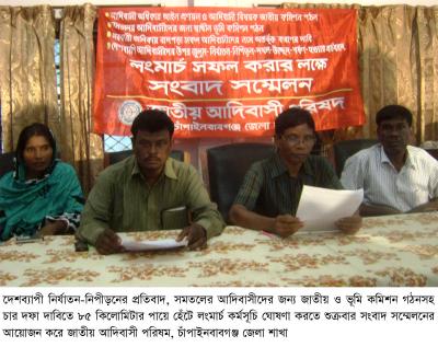 সকালে স্থানীয় টাউন কাব মিলনায়তনে অনুষ্ঠিত সংবাদ সম্মেলনে জাতীয় আদিবাসী পরিষদের কেন্দ্রীয় সভাপতি রবীন্দ্রনাথ সরেন বলেন বাংলাদেশের ১৫ লাখ আদিবাসী ভূমি অধিকারের জন্য লড়াই সংগ্রাম করে আসছে। জুলুম নির্যাতন থেকে আদিবাসীদের রায় আদিবাসী অধিকার আইন প্রনয়ন ও জাতীয় কমিশন গঠন, সমতলের আদিবাসীদের জন্য স্বাধীন ভূমি কমিশন গঠন, সরকারী তালিকায় বাদ পড়া সকল আদিবাসীদের নাম অর্ন্তভূক্তি ও দেশব্যাপী আদিবাসীদের উপর জুলুম নির্যাতনের বিচারের দাবীতে আগামী ২ অক্টোবর চাঁপাইনবাবগঞ্জের নাচোল থেকে রাজশাহী অভিমুখে লং মার্চ কর্মসূচী গ্রহন করা হয়েছে। কর্মসূচীর প্রথম দিনে সকাল ১০ টায় নাচোল বাসস্ট্যান্ড থেকে লংমার্চ শুরু হয়ে রাজশাহীর কাকনহাটে রাত্রীযাপনের পর পরের দির ৩ অক্টোবর সকালে রাজশাহী অভিমুখে যাত্রা করবে। সংবাদ সম্মেলনে জাতীয় আদিবাসী পরিষদের চাঁপাইনবাবগঞ্জ জেলা কমিটির সভাপতি বিচিত্রা তিরকী, আদিবাসী নেতা মদন কুমার বড়ুয়া, বিমল চন্দ্র রাজোয়াসহ অন্যান্য নেতারা উপস্থিত ছিলেন।