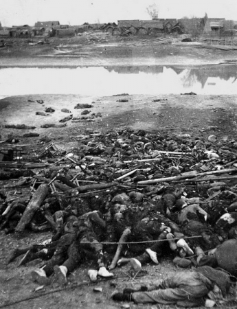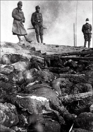 নানচিনের গণহত্যার সময় নানচিনের পশ্চিম গেটে কিনহুআই (Qinhuai) নদীর তীরে মৃতদের একাংশ এবং পাশে একজন জাপানী সৈন্য দাঁড়িয়ে আছে।