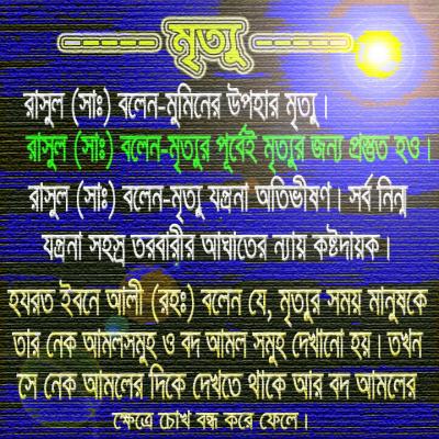 " তরবারীর তিন শ'টি আঘাতের যন্ত্রনা একত্র করলে যা দাঁড়াবে, মৃত্যু যন্ত্রনা তার চেয়েও অনেক বেশী কষ্ট দায়ক বিবেচিত হবে।" (ইবনে আবিদ-দুনিয়া)