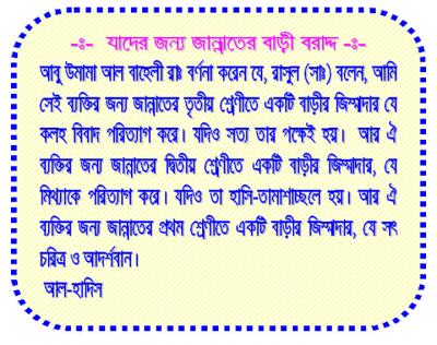 আবু উমামা আল বাহেলী (রাঃ) বর্ণনা করেন যে, রাসুল (সাঃ) বলেন, আমি সেই ব্যক্তির জন্য জান্নাতের তৃতীয় শ্রেণীতে একটি বাড়ীর জিম্মাদার, যে কলহ বিবাদ পরিত্যাগ করে। যদিও সত্য তার পক্ষেই হয়। আর ঐ ব্যক্তির জন্য জান্নাতের দ্বিতীয় শ্রেণীতে একটি বাড়ীর জিম্মাদার, যে মিথ্যাকে পরিত্যাগ করে। যদিও তা হাসি-তামাচ্ছলে হয়। আর ঐ ব্যক্তির জন্য জান্নাতের প্রথম শ্রেণীতে একটি জিম্মাদার, যে সৎ ও চরিত্রবান।