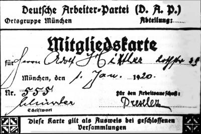 অবশেষে ১২ই সেপ্টেম্বর ১৯১৯ সালে তিনি সামরিক বাহিনী থেকে সরে এসে German Workers' Party (DAP) তে যোগ দেন। তিনি ছিলেন ৫৫ তম সদস্য। তিনি যখন German Workers' Party (DAP) এর সদস্য হন, তখন কোনো কার্ড এর প্রচলন ছিলো না। কার্ড দেয়া নয় ১৯২০ সাল থেকে। তার কার্ডে ৫৫৫ নম্বর দেখা যায়। মূল বিষয়টা হলো, সদস্য সংখ্যা বেশি দেখানো জন্য নম্বর শুরু হয় ৫০১ থেকে।