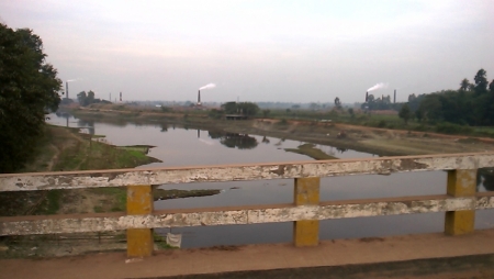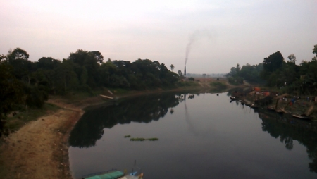 [ছবি ৪) এক দিকে নদী দূষণ অন্যদিকে ইট ভাটার দূষণ]