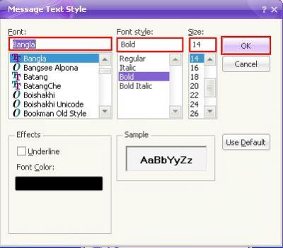 এরপর আপনার পছন্দ অনুযায়ী যে কোন বাংলা Unicode Font এবং তার Size Select করে OK দিন। তাহলে আপনাকে বারবার আর Font পরিবর্তন করতে হবে না। আর এভবে ভাল না লাগলে "Use Default" দিলেই সব আগের মত হয়ে যাবে।