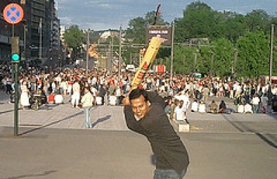 অসলো টাউন হলের সামনে বিশাল কনসার্ট। আমি আর টিপু ভাই ভাবলাম ক্রিকেট শেখানোর জন্য আর ভাল জায়গা পাওয়া যাবেনা। আরেক কলিগকে কনসার্ট দেখতে বসিয়ে দিয়ে আমরা এক পাশে খেলা শুরু করলাম। দেখতে দেখতে বেশ কিছু আগ্রহী শিক্ষাথর্ী জুটে গেলো। মদ্যপ এক তরুনীর হাত থেকে ব্যাট পড়ে গিয়ে জয়েন্ট ছুটে গেলো। বেচারা ব্যাট! আরো বেচারা আমরা!!!