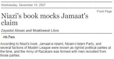 ডেইলি স্টারে "Niazi's book mocks Jamaat's claim" শিরোণামে একটি লেখা ছাপা হয়েছিল। Click This Link । বেশ আগের রিপোর্ট, একবন্ধু রিসেন্টলি FB তে পোস্ট করায় চোখে পড়ল।