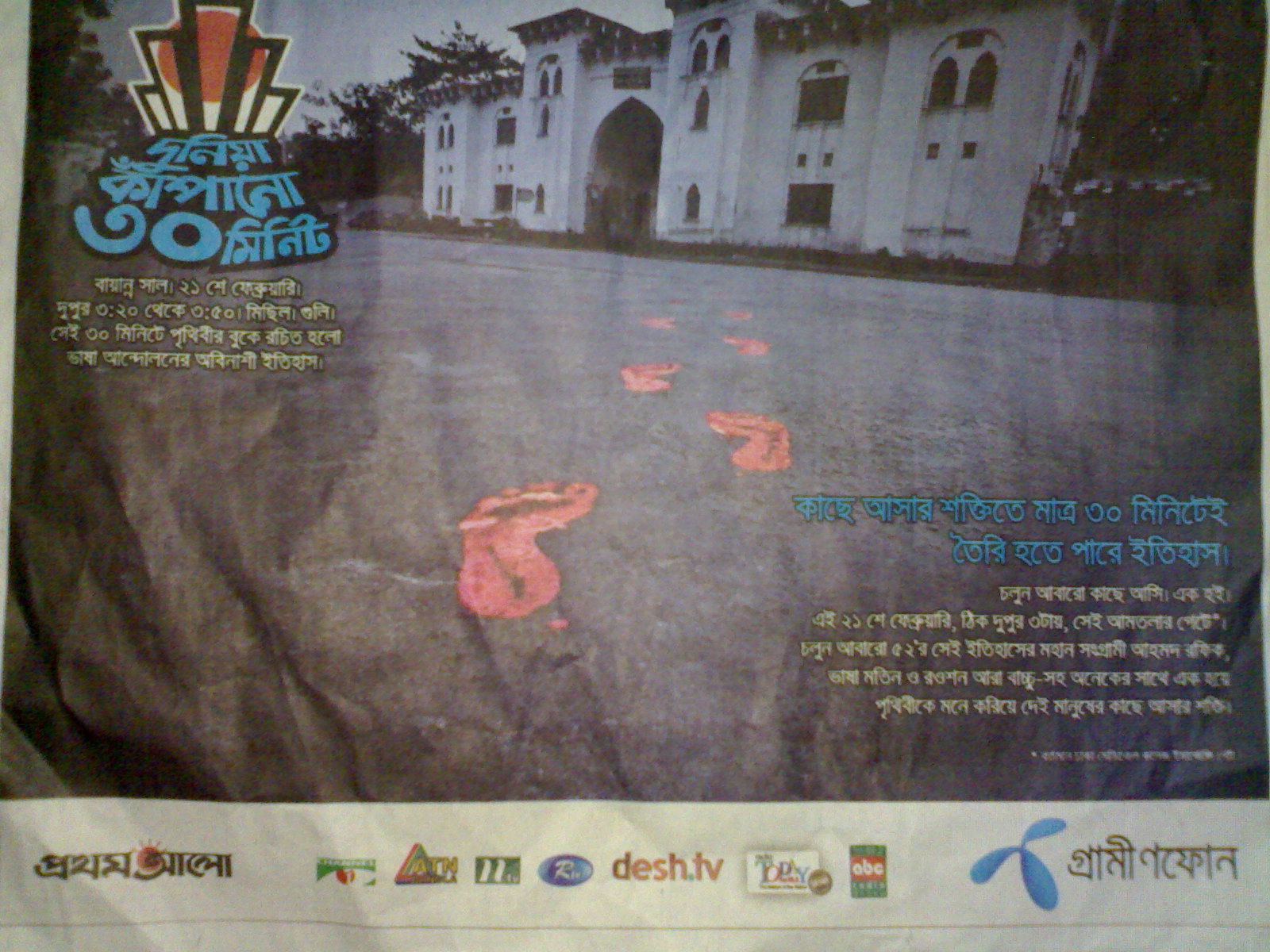 বিষয়টা কি? গ্রামীণ ফোন কি তার কর্পোরেট শ্লোগান দিতে ভুলে গিয়েছিল নাকি এটা ছাপার ভুল? এর উত্তর মেলে তার দুইদিন পর ১৮ ফেব্রুয়ারি তারিখের প্রথম আলোতে ছাপা গ্রামীণ ফোনের দু্টি বিজ্ঞাপন দেখে। এখানেও একই ব্যাপার- পৃষ্ঠা ২৩ এ ছাপা প্রিপেইড কার্ডের বিজ্ঞাপণটির এক কোনায় ”কাছে থাকুন। গ্রামীণ ফোন” কথাটি লেখা থাকলেও ৩য় পৃষ্ঠার প্রায় অর্ধেক জুড়ে ছাপা ”দুনিয়া কাঁপানো ৩০ মিনিট” শীর্ষক বিজ্ঞাপনটিতে আগের মতোই এই কথাগুলো লেখা ছিল না- ফলে বিষয়টি পরিস্কার যে এটা নিছক কোন ছাপার ভুল বা অবহেলা নয় বরং খুব সুনির্দিষ্ট কারণেই এই শ্লোগানটি বিজ্ঞাপনে দেয়া হয় নি। আর সেই কারণটি হলো- একুশের ৩০ মিনিট কে কেন্দ্র করে দেয়া গোটা বিজ্ঞাপনটিরই গ্রামীণ ফোনের কর্পোরেট শ্লোগানে রূপান্তরিত হয়ে যাওয়া- ফলে ঐ বিজ্ঞাপনে আলাদা করে আর ”কাছে থাকুন। গ্রামীণ ফোন” শ্লোগানটির কোন প্রয়োজন থাকলো না!