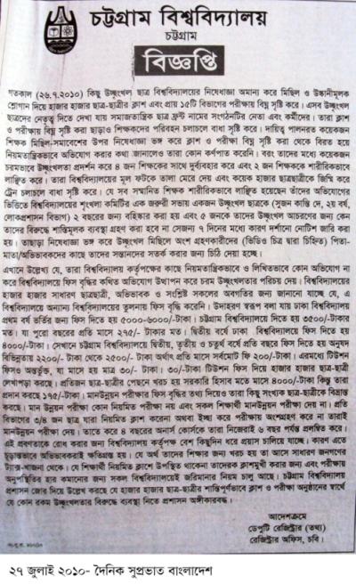 বিজ্ঞাপনটিতে প্রশাসন আন্দোলনরত ছাত্রছাত্রীদের বিরুদ্ধে উচ্ছৃংখলা প্রদর্শনের অভিযোগ তুললেও বাস্তবতা হলো গত সোমবার সকাল ১১ টায় ছাত্র-ছাত্রীরা যখন প্রক্টর অফিসের সামনে শান্তিপূর্ণ মানববন্ধন করার প্রস্তুতি নিচ্ছিল, সন্মানিত প্রক্টররাই সেখানে ছাত্র-ছাত্রীদের মানববন্ধনে বাধা দেন, এমনকি ব্যানার কেড়ে নেয়ার মতো অসভ্যতা করেন, তারপরও ছাত্রছাত্রীরা মানববন্ধন চালিয়ে যেতে থাকলে একপর্যায়ে প্রক্টর চন্দন কুমার পোদ্দার দুই শিক্ষার্থীকে শারীরিক ভাবে লাঞ্ছিত করেন। বিজ্ঞাপনের এসবের কোন উল্ল্যেখ না করে উল্টো বলা হয়েছে: