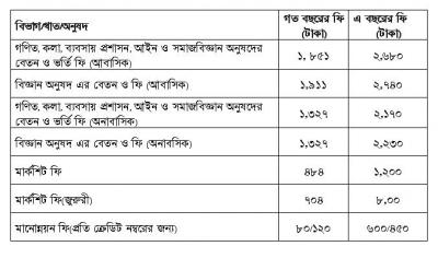 এছাড়াও বাড়ানো হয়েছে নন-কলেজিয়েট ও ডিজ-কলেজিয়েট ফিও। নন-কলেজিয়েট ফি রাখা হয়েছে এক হাজার টাকা আর ডিজ-কলেজিয়েটের ক্ষেত্রে রাখা হয়েছে ৩ হাজার থেকে ৭ হাজার টাকা। এ তো গেল অনার্সের কথা। মাস্টার্সে গণিত, কলা, ব্যবসায় প্রশাসন, আইন ও সমাজবিজ্ঞান অনুষদের বেতন ও ভর্তি ফি (অনাবাসিক) গত বছর ছিল ২০৩১ টাকা। এ বছর ২৯২০ টাকা। আর আবাসিকদের গত বছর ছিল ২৪৫৫ টাকা। এ বছর তা বাড়িয়ে করা হয়েছে ৩৪২০ টাকা।