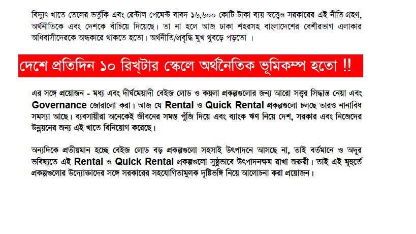 অথচ কুইক রেন্টালের মাধ্যমে কুইক লুটপাটের ধান্দা বাদ দিয়ে সমন্বিত উদ্যোগ নিলে দুই বছরও লাগতো না, ৬মাস থেকে ১বছরের মধ্যে ১২০০-১৩০০ মেগাওয়াট বিদ্যুৎ সস্তায় পাওয়া যেত।