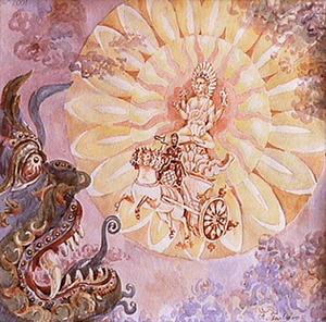 গরুড় তার দাদা অরুণকে নিয়ে গিয়ে সূর্যের রথে উপর বসালেন।