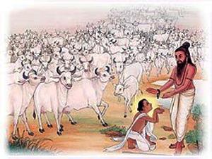 এক শিষ্যকে গুরু তার গরুগুলিকে দেখভালের দায়িত্ব দিলেন। গুরুর আজ্ঞায় শিষ্য গরুগুলির সেবা করে।