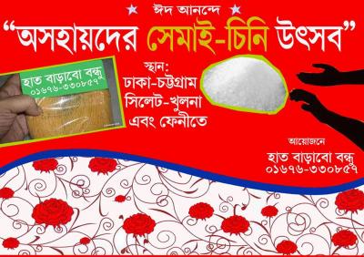 কয়েকজন লেখক ও পাঠক লেখকের সমন্বয়ে গড়া গ্রুপ " হাত বাড়াবো বন্ধু" । অসহায় ও রাস্তার মানুষগুলোর পাশে দাঁড়ানোর প্রত্যাশা নিয়ে আমাদের এই গ্রুপের যাত্রা শুরু হয়েছে। আমরা আমাদের হাত খরচ থেকে কিছু টাকা বাঁচিয়ে চেষ্টা করছি অসহায় মানুষের পাশে দাঁড়ানোর। তবে আমাদের সে অর্থ খুবই সীমিত, তবুই আমাদের সকলের প্রবল ইচ্ছা শক্তি থাকার কারণে আমরা আসন্ন রমজানের ঈদকে সামনে রেখে কিছু অসহায় মানুষের হাতে সেমাই চিনি তুলে দিতে চাই। জানিনা ঠিক কত জনের হাতে আমরা সেমাই-চিনি তুলে দিতে পারবো। ঢাকা, চট্রগ্রাম, সিলেট, খুলনা ও ফেনীতে আমরা ২৫ রমজান থেকে ঈদের আগের দিন পর্যন্ত অসহায় মানুষের হাতে সেমাই-চিনি তুলে দেব ইনশাল্লাহ। তাই আমাদের পাশাপাশি আপনারাও সাহায্যের হাত বাড়িয়ে আমাদের এই কার্যক্রমকে দীর্ঘায়িত করতে পারেন। আপনাদের সকলের সাহায্য সহযোগিতা ও উৎসাহ পেলে আমরা অনেকগুলো পরিবারে ও রাস্তার মানুষকে সেমাই-চিনি বিতরণ করতে সক্ষম হব।