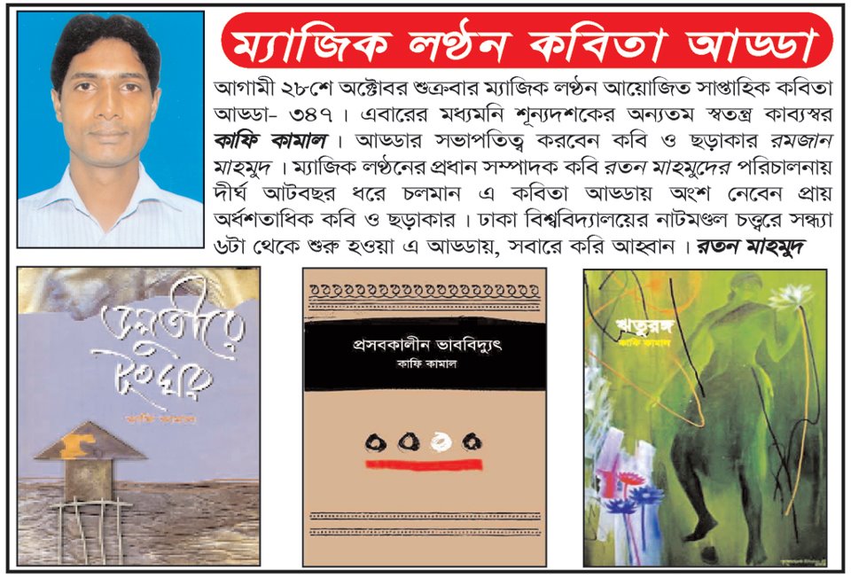 কাফি কামালের কবিতায় রূপ সচেতনতা স্পষ্ট। তার কবিতায় সহজ-সরল বিবরনমূলক উচ্চারণের চেয়ে, অঙ্গিকারের চেয়ে; আলঙ্কারিক রূপক-উৎপ্রেক্ষার ব্যবহার প্রধান্য পেয়েছে। আমার ধারনা এটা একটি প্রক্রিয়া, একটি নিরীক্ষা। কবিতার তার এ ধরনের পরীক্ষা-নিরীক্ষা সফল হলে তিনি আমাদের সমকালীন বাংলার কবিদের ভেতর একজন আলাদা কবি হয়ে উঠবেন। সেদিন খুব বেশিদিন দূরে বলে মনে হচ্ছে না। কারণ তার পরবর্তী যে কবিতাগুলো আমি এখানে এসে পড়লাম এবং শুনলাম তাতে দেখা যাচ্ছে, সে যে কোন বিষয়কে কবিতা করে তোলার চেষ্টা করছে। যেমন, কর্মক্ষেত্রে যখন সে বিচরণ করছে, রাজনীতির সংবাদ যখন করতে গিয়ে ভেতর-বাইরের পরিস্থিতি তুলে আনছে কবিতায়। ভাল কবির, বড় কবির লক্ষণ হচ্ছে- যে কোন বিষয়কে কবিতায় পরিণত করতে পারে। সে গুন তার আছে। আমি বলব, তার কবিতার মধ্যে একটা স্পর্ধা দেখা যাচ্ছে। কাফি কামালকে নিয়ে তাই আমি আশাবাদী। এ কবিতার আসরে যাদের কবিতা আমি শুনেছি, আড্ডার কবি হিসাবে অনেকের মধ্যে যে কয়জন তরুণকে পেয়েছে তাদের কবিতা আমাকে আশান্বিত করেছে। কাফি কামাল তাদেরই একজন। আরেকটি কথা বলেই আমি শেষ করব। ম্যাজিক লণ্ঠনের ৩৪৮তম আড্ডা হচ্ছে আজ। তার অর্থ কি? মানে সমকালীন বাংলা কবিতায় পুরোনোদের দিন প্রায় শেষ। শুরু হয়েছে নতুনদের, নতুন শতকের, নতুন দশকের কবির দিন। শুরুতেই নতুনদের অন্যরকম ভাষা, অন্যরকম নির্মাণ, অন্যরকম তৎপরতা দেখছি। আমার মনে হচ্ছে- বাংলা কবিতা অবশ্যই কাফি কামালের মত নতুনদের হাতে সযতœ চর্চিত হয়ে নতুন বাঁক নেবে। আর তাতেই বাংলা কবিতায় একটা জাদুকরি কাণ্ড ঘটে যাবে। জাদুকরি কাণ্ড সংগঠনের ক্ষেত্রে প্রধান যে অনুপ্রেরণা যোগাচ্ছে তা হচ্ছে একটি জাদুকরি বৈঠক। আমরা বলি- ম্যাজিক লণ্ঠন। কবিতা আসলেই ম্যাজিক লণ্ঠন। আজকের আড্ডার কবি কাফি কামালসহ সবাই সে জাদুকরি আলোয় আলোকিত হোন।