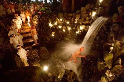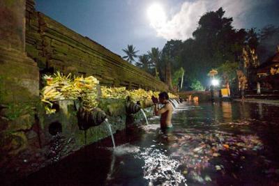 ইন্দোনেশিয়ার বালি দ্বীপের পুরা তীর্থ মন্দিরে পূর্ণিমা রাতে প্রার্থনা। জনশ্রুতি আছে এই মন্দিরের সরোবর ইন্দ্র নিজে নির্মান করেছেন আর এখানে স্নান করলে পূণ্য ও রোগারগ্য লাভ হয়।