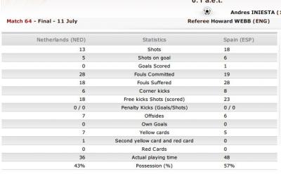 রেফারি আইজকা কয়ডা কার্ড দেখাইসে, সেইডা সবাই জানেন। টোটাল দেখাইসে ১৪টা। হলুদ কার্ড ৭ টা নেদারল্যান্ডস আর ৫ টা স্পেন। সেইসাথে নেদারল্যান্ডসের হেইটিংগা দুই হলুদে একটা লাল কার্ড খাইসে। যার কি না আরও আগেই লাল কার্ড দেখার কতা।