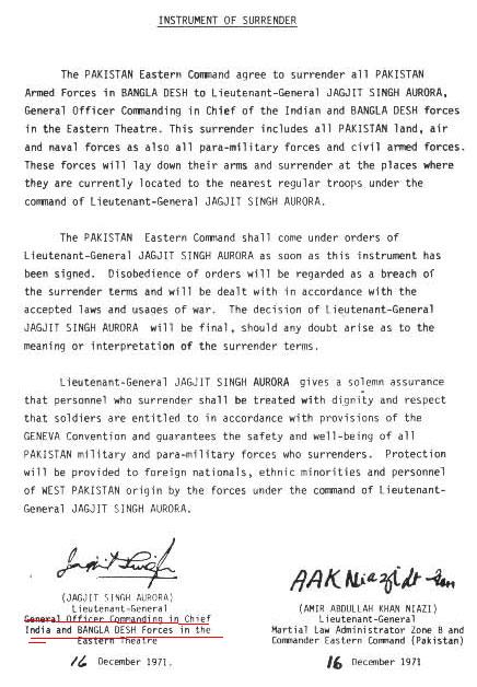 ১৯৭১ সালে পাকিস্থানী বাহিনী আত্নসমর্পন করে - সেই আত্নসমর্পন দলিলে পাকিস্থানের পক্ষে স্বাক্ষর করে জেনারেল নিয়াজী আর ভারত-বাংলাদেশের পক্ষে স্বাক্ষর করে জেনারেল অরোরা। ( দলিলে নিয়াজীর স্বাক্ষরের নীচের লাইন দ্রষ্টব্য)