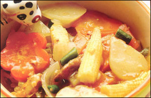 যা যা লাগবে : পেঁপে টুকরা ১ কাপ, গাজর টুকরা ১ কাপ, বরবটি ২টি টুকরা করা, বেবিকন কয়েকটি, পেঁয়াজ পাতা পরিমাণমতো, মুরগির বুকের মাস আধা কাপ, মুরগি মাখানোর জন্য আদা রসুন বাটা আধা চা চামচ, সয়াসস ১ চা চামচ, টমেটো সস ১ টেবিল চামচ, চিনি সামান্য, লবন আন্দাজমতো, তেল ১ টেবিল চামচ, বড় পেঁয়াজ ১টা কোয়া ছাড়ানো, রসুন কুচি সামান্য, কাঁচামরিচ (আস্তা) ২টি।