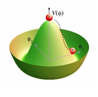 আরেকটা উদাহরন দিতে পারি, যেটা হলো একটা ম্যাক্সিকান টুপি নীচের ছবির মতোই যেখানে আপনি একটি বল রেখে দিলেন ঠিক ওর চূড়ার উপর। আপনি বলটার উপরই ছেড়ে দিলেন বলটা কোন দিক দিয়ে পড়ে চলা শুরু করবে। এই ছবিতে ক্যাপের উচূ চূড়ার নীচ যে অন্ঞ্চল যেখানে বলটা পড়ে ঐ রাস্তা দিয়ে ঘুরবে সেটাকে হিগস ফিল্ডের সর্বনিম্ব এনার্জী স্টেট হিসেবে ধরে নিতে পারি।এখানে এই ক্ষেত্রটি দেখা যাচ্ছে যে স্বতঃস্ফূর্ত ভাবে বেছে নেয়া হচ্ছে বলেই এটাকে একটা নির্দিষ্ট বিন্দুতে স্বতঃস্ফূর্ত প্রতিসাম্যতা ভেঙ্গে যায়।