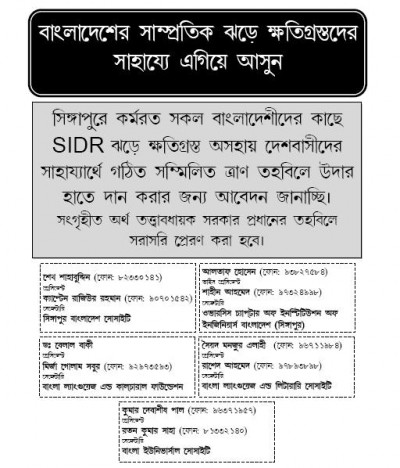 সিঙ্গাপুরে অবস্থানরত সকল বাংলাদেশীদের জন্য একটি সমন্বিত ত্রাণ তহবিল গঠন করা হয়েছে, যা তত্ত্বাবধায়ক সরকার প্রধানের তহবিলে প্রেরণ করা হবে। সকল ধরনের বাংলাদেশী সংগঠন ছাড়াও ওভারসীজ চেপ্টার অব ইন্সটিটিউট অব ইঞ্জিনিয়ার্স বাংলাদেশ, সিঙ্গাপুর (OCIEBS)য়ের সদস্য, ন্যাশনাল ইউনিভার্সিটি অফ সিঙ্গাপুর (NUS) এবং নানইয়াং টেকনোলজিক্যাল ইউনিভার্সিটির (NTU) বাংলাদেশী ছাত্র ও শিক্ষকরাও এতে সক্রিয় অংশগ্রহন করছেন। আপনি যদি সিঙ্গাপুর থেকে আপনার সাহায্য পাঠাতে চান, তাহলে এই তহবিলের মাধ্যমে তা করতে পারেন। ছবিতে এই তহবিল সংক্রান্ত আপিলটি সংযুক্ত করা হলো।