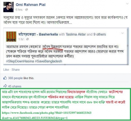 ২- আর অমি পিয়াল বাঁশেরকেল্লার স্ট্যাটাসের স্ক্রিনশট নিয়ে ফটোশপের মাধ্যমে এডিট করেছে নিজের মত করে। এবং সেটা অপবাদ চাপানোর চেষ্টা করেছে বাঁশেরকেল্লার প্রতি। পিয়ালের স্ট্যাটাসের স্ক্রিনশট নিচে দেয়া হল।