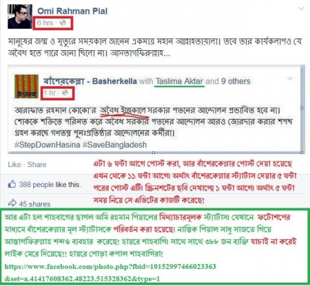 যে স্ট্যাটাসের মাধ্যমে পিয়াল বাঁশেরকেল্লাকে অপবাদ দেয়ার চেষ্টা করে ব্যর্থ হয়েছে, তার ব্যাপারে চিন্তা করতে এবং এডিট করতে সে সময় নিয়েছে প্রায় ৫ ঘন্টা। কিন্তু তারপরও ঠিকমত পারেনি। সময়ের ব্যাপারটি ছবির মধ্যে লালকালি দিয়ে বলা হল। দুঃখজনক ব্যাপার হচ্ছে, শাহবাগিরা অনেকেই পিয়ালের এ স্ট্যাটাসে লাইক এবং শেয়ার মেরে দিয়েছে, চোখ বন্ধ করে। সামান্য একটু যাচাইয়েরও প্রয়োজন মনে করেনি। সেজন্যই তো শাহাবাগিদেরকে ছুপা ছাগু বলা হয়।