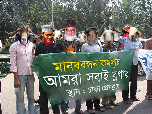 মানববন্ধনে যাওয়া হাতেগোনা যে কজন ব্লগার হিসেবে পরিচয় দিচ্ছেন পোস্টে পোস্টে, দু একজন ছাড়া তাদের সবাই জামায়াত সমর্থক কিংবা শিবির কর্মী হিসেবে ব্লগে অনেকদিন ধরে চিহ্নিত। আর মাত্র তিনজনের ব্যাপারে বলতে পারি, তারা শ্রেফ বিভ্রান্ত হয়ে কিংবা আয়োজকদের সম্পর্কে না জেনে সেখানে হাজির হয়েছিলেন। ব্লগার কৌশিকের নাম আমরা দেখেছি। তিনি মূলত গিয়েছিলেন মোশরেফা মিশুকে আয়োজিত এক মানববন্ধনে অংশ নিতে, যা আয়োজিত হয়েছিল আজকের জামায়াতি মানববন্ধনের পাশেই। নিতান্ত কৌতূহলবশত তিনি ঢুঁ মেরেছিলেন ছাগবন্ধনে। ইসলামী ছাত্রী সংস্থার কয়েকজন মেয়েকে সামনে রেখে আরেক কৌতুককর কাণ্ড করার চেষ্টাও করেছিল দেখছি।