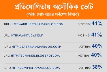 অবস্থা দেখুন।ওদিকে সেরা ব্লগ বিভাগে ৪০% ভোট নিয়ে সাবরিনার ব্লগ শীর্ষে আছে, ২২% ভোট নিয়ে দ্বিতীয় স্থানে আছে একটি অ্যারাবিক ব্লগ। আরবীভাষীদের অবস্থাও দেখুন একনজর। বিপরীতে বাংলাদেশের ইন্টারনেট পরিস্থিতি দেখুন, ব্লগারের হিসাব আশা করি না নিলেও চলবে। সুতরাং সেই একই প্রশ্ন আবারও- এতো ভোট আসছে কোত্থেকে? আকাশের ওপর থেকে নয় তো?