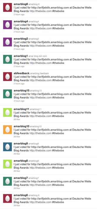 আরিল বলেছেন: since last friday, we have raised concerns about massive vote manipulation in "the bobs" with DW. if the online vote results become so one-sided and out of proportion like it seems now, it would be shameful for the whole bangla blogosphere, as well as for DW. we hope DW will investigate these claims and discard manipulated votes if and when found, as we remain with unanswered questions and are appalled by what we see.
