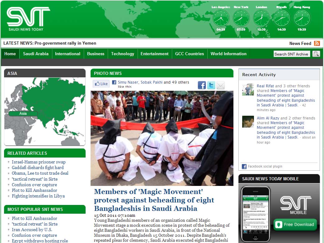 ঢাকায় আজকের প্রতীকী প্রতিবাদের পরপরই খবরটি গুরুত্ব দিয়ে প্রকাশ করেছে সৌদি নিউজ টুডে। যার শিরোনাম ছিল - Members of 'Magic Movement' protest against beheading of eight Bangladeshis in Saudi Arabia. সৌদি জনগণ জানলো, বাংলাদেশিরা শুধুই তরবারির নিচে মাথা পেতে দিতে জানে না, প্রতিবাদও করতে জানে।