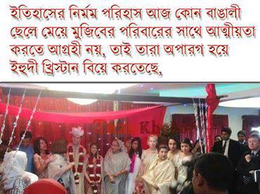 রেহানার মেয়ে টিউলিপের বিয়ের মধ্য দিয়ে প্রধানমন্ত্রীর বোনের পরিবারও বিধর্মীদের সঙ্গে আরও একটি আত্মীয়তায় প্রবেশ করল। শেখ রেহানার ছেলেও বিধর্মী মেয়েকে বিয়ে করেছেন। প্রধানমন্ত্রী শেখ হাসিনার তনয় সজীব ওয়াজেদ জয় আমেরিকায় বিয়ে করেছেন একজন বিধর্মীকে। হয়তো প্রধানমন্ত্রীর ছেলে বা বোনের মেয়ের জন্য উপযুক্ত বাঙালি কোনো বর, কনে খুঁজে পাননি বা বাংলাদেশের প্রতি তাদের দরদ বেশি! এজন্য বিদেশি ও বিধর্মীদের বিয়ে করে আত্মীয়তার সম্পর্ক সম্প্রসারণ করছেন। প্রধানমন্ত্রীর মেয়ে পুতুলের জামাতাও বাংলাদেশের ফরিদপুরের বিখ্যাত রাজাকারের নাতি। অর্থাৎ বাঙালি না কেউ-ই। প্রধানমন্ত্রী ও তার বোনের বেয়াই পরিবার হয় বিধর্মী না হয় অবাঙালি।শেখ মুজিবুর রহমানকে তারা হাজার বছরের শ্রেষ্ঠ বাঙালি বলতে বলতে মুখে ফেনা তোলেন। দেশপ্রেমের কথা বলে তারা মানুষের কাছে ভোট চাইতে যান ।