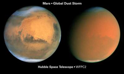 বামের ছবিতে স্বাভাবিক মঙ্গল গ্রহ আর ডানের ছবিতে দেখা যাচ্ছে ধুলিঝড় পুরো মঙ্গলকে ছেয়ে ফেলেছে