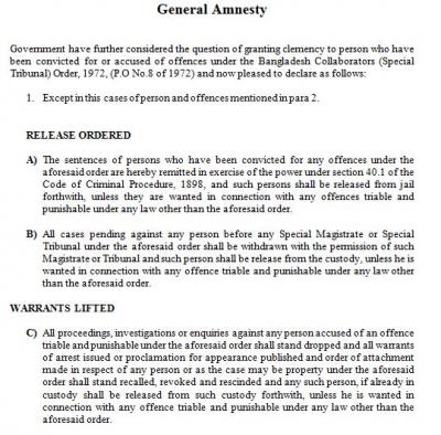 উল্লেখ্য যে, সাধারণ ক্ষমা ঘোষনার পরেও প্রায় ১১ হাজার যুদ্ধাপরাধী কারাগারে বন্দী ছিলেন।