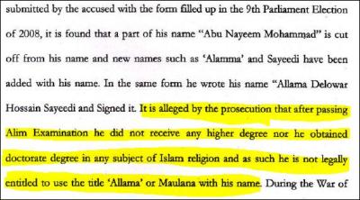 এখন প্রশ্ন দাঁড়ায় সাঈদী কি তার নামের আগে আল্লামা লিখতে পারে ? কেননা ২০০৮ সালের নির্বাচনী প্রত্যয়ন পত্রে সাঈদী লিখেছে যে তার সর্বোচ্চ শিক্ষাগত যোগ্যতা হচ্ছে আলীম পাশ। মানে ইন্টারমিডিয়েট সমতূল্য। সুতরাং আলীম পাশ যেখানে সাঈদীর সর্বোচ্চ শিক্ষাগত যোগ্যতা সেখানে নামের আগে সাঈদী কোন হিসেবে আল্লামা লিখে? এই কথাটি সাঈদীর বিরুদ্ধে আসা রায়ের ৮ নাম্বার পাতায় লেখা রয়েছে। সাঈদীর ২০০৮ সালের প্রত্যয়নপত্রে উল্লেখিত সর্বোচ্চ শিক্ষাগত যোগ্যতা এবং রায়ে উল্লেখ করা সেই অংশটি নীচে দেয়া হোলোঃ