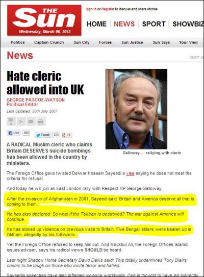 ধর্ষক, লম্পট, খুনী দেইল্লা রাজাকার শুধু দেশেই অপরাধ করে ক্ষান্ত হয়নি। এই হারামজাদা ইংল্যান্ডে গিয়েও দেশের ১২টা বাজিয়ে দিয়ে এসেছিলো ২০০৬ সালে। ইসলাম ধর্মের কথা বলে সেখানে এই ধর্মকে সবার সামনে হেয় করেছিলো দেইল্লা। সে সময় সাঈদী বলেছিলো "ইংল্যান্ডে ও আমেরিকায় বোমা মারা একদম সঠিক। ইংল্যান্ড বোমা খাওয়া ডিজার্ভ করে" তখন ইংল্যান্ডের বিখ্যাত ট্যাবলয়েড সাঈদী কে নিয়ে The Sun একটি রিপোর্ট প্রকাশ করে ১৫-ই জুলাই ২০০৬ সালে। লেখাটির শিরোনাম ছিলো- Ban this beast and Kill Brits Hate Cleric let into UK, এখানে সাঈদীকে "জানোয়ার" হিসেবে অভিহিত করা হয়। দয়া করে এই তথ্যটি আপনি ফেসবুক, টুইটার সবখানে ছড়িয়ে দিন। সে সময়কার ব্রিটিশ পাঠকদের প্রতিক্রিয়া দেখুন এইখানে