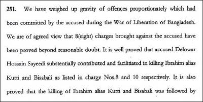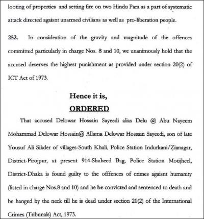 রাজাকার সাঈদীর বিরুদ্ধে যে অভিযোগগুলো আনা হয়েছিলো সেটির মধ্যে ৬,৭,৮,১০,১১,১৪,১৬ এবং ১৯ নাম্বার অভিযোগ সন্দেহাতীত ভাবে প্রমাণিত হয়েছে। বিচারকেরা ৮ এবং ১০ -এ বর্ণিত অভিযোগের ব্যাপকতা অন্য প্রমাণিত অভিযোগের তুলনায় অনেক বেশী মনে করেছেন এবং এই দুটি ক্ষেত্রেই সাঈদীর মৃত্যুদন্ড দিয়েছেন। অন্য অপরাধগুলো সন্দেহাতীত ভাবে প্রমাণিত হলেও যেহেতু ৮ আর ১০ নাম্বার এর ক্ষেত্রে মৃত্যুদন্ড দিয়েছেন তাই বাকী গুলোতে আর আলাদা করে কোনো শাস্তি দেননি।